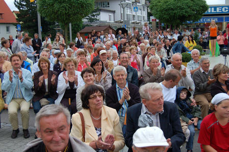 Wieder einmal drohte das Wetter den Stadtkapellen-Musikern einen Strich durch die Rechnung zu machen. Diese ließen sich jedoch auch durch nasse Instrumente und Noten nicht beirren und hielten die zahlreichen Zuhörer auch unter Regenschirmen bei bester Laune. Einen großen Anteil an der guten Stimmung hatten auch die Modenschau-Models sowie die wirbelnden Blumberger Realschüler.
